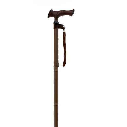 This folding crutch is made of aluminium. The tube is brown and the handle is ergonomic with a soft touch. Its main characteristics are the following: