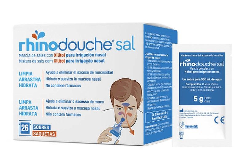 Rhinodouche is a nasal irrigator for high-volume cleaning, allowing the removal of excess mucus, secretions, contaminant particles, allergens and pathogens deposited in the nasal mucosa. Its flexible device allows the preparation of saline solution inside and the liquid to be pushed into the nasal passages and paranasal sinuses by pressing it. The pressure is easily adjusted by hand. It fits perfectly into the nostril thanks to its ergonomic nasal adapter. It is reusable and easy to transport. The solution obtained with Rhinodouche Sal helps to thin the mucus, facilitating its expulsion.
